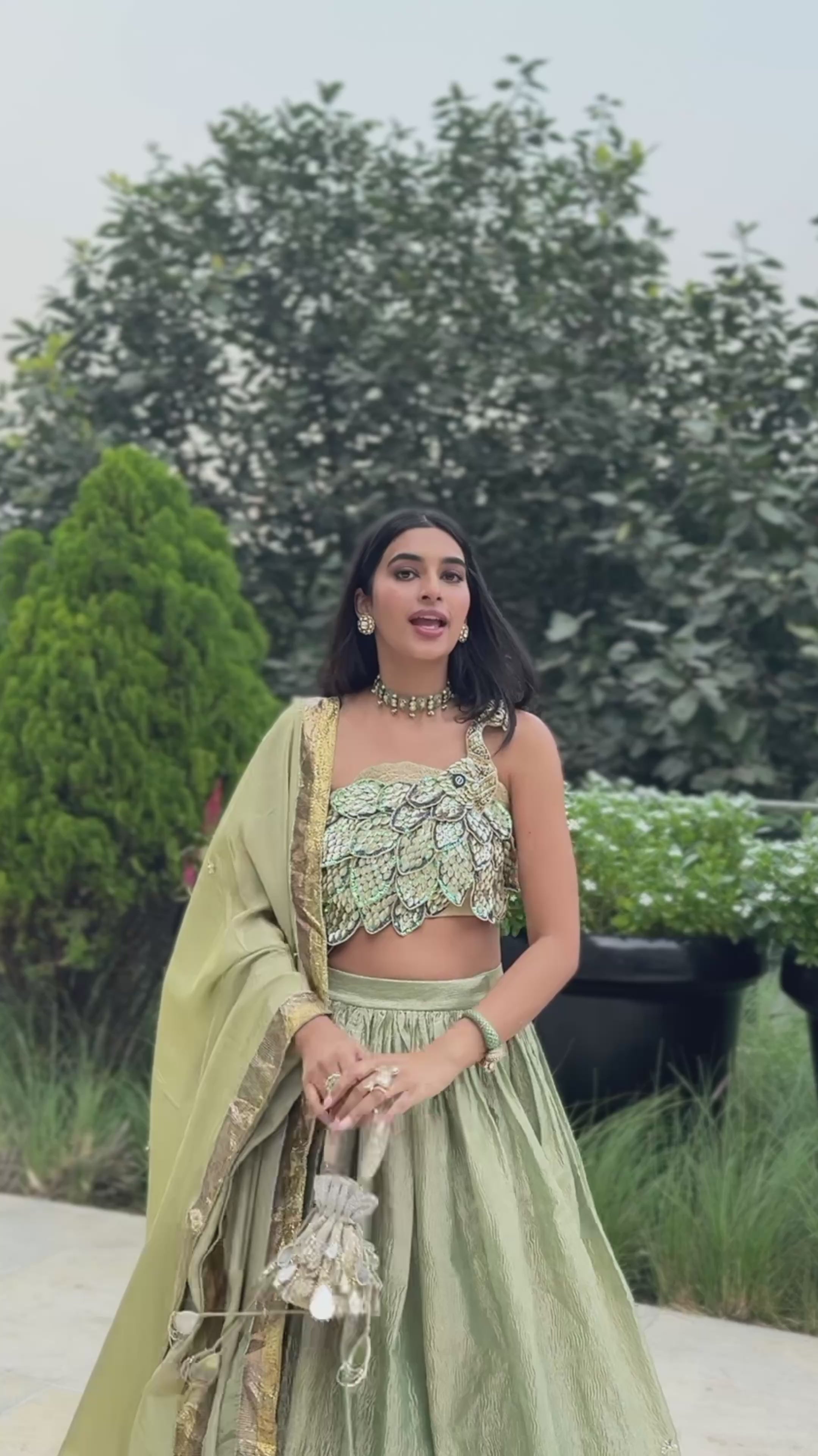 A statement ensemble featuring a hand-embroidered peacock blouse with delicate dori detailing at the back, paired with a graceful tissue lehenga and a matching tissue dupatta.