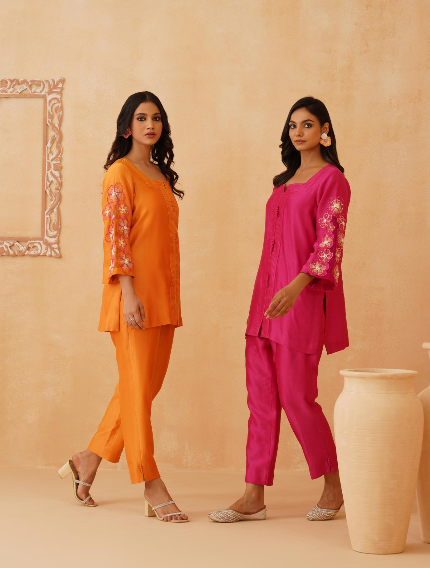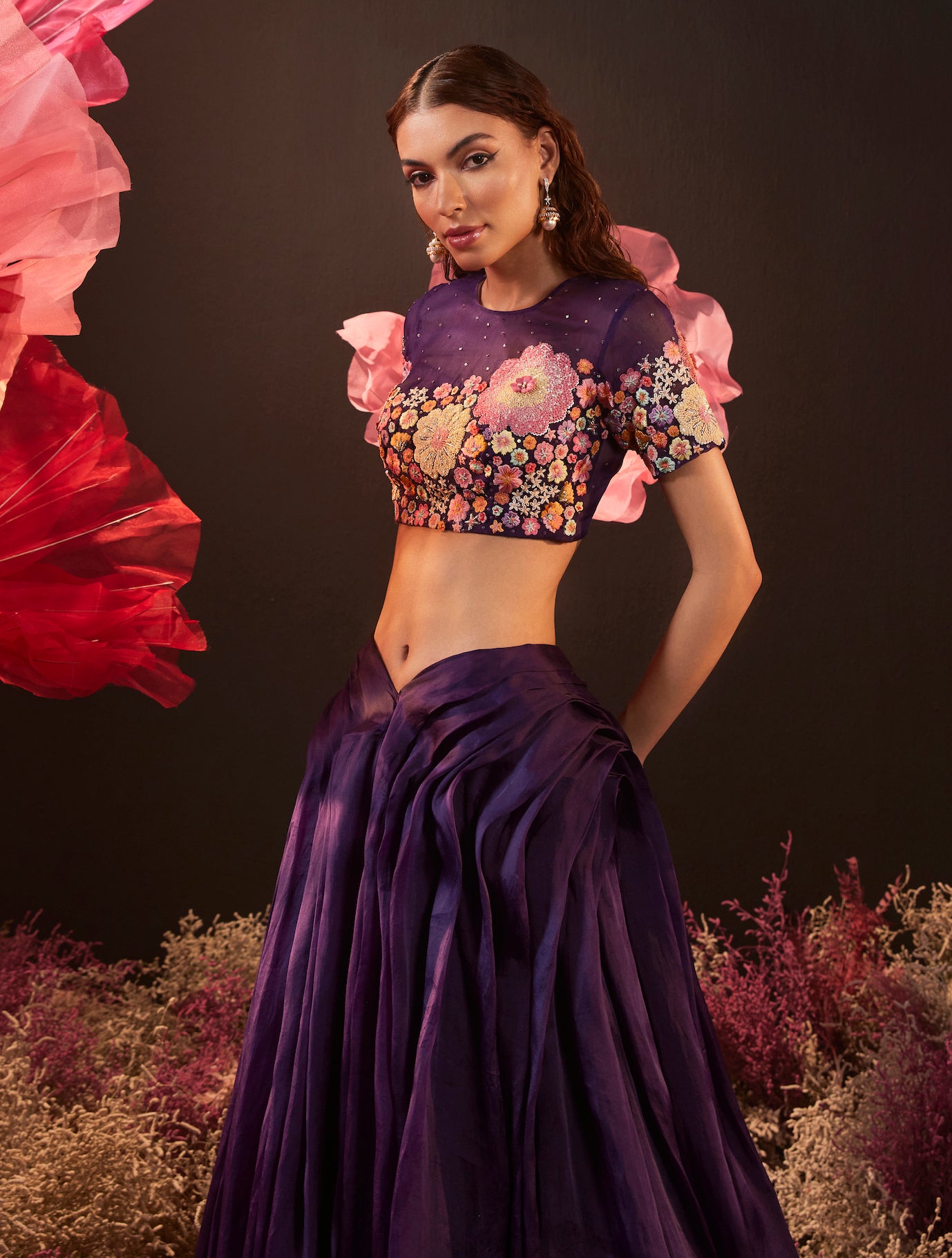 In a mesmerising shade of blue, this elegantly draped skirt is paired with a smocked blouse. Adorned with exquisite crystal embellishments, this ensemble effortlessly combines style and sophistication.
